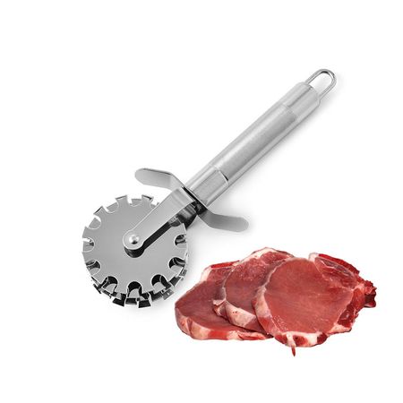 The Problem Feeding your dog raw meat but it's too tough? They struggle to chew, risk tooth damage, and leave half uneaten. Prep time drags on with knives or mallets. ## The Solution Roll this five-wheel tenderizer over raw meat. Piercing blades break down fibers fast, making it soft and easy for pets to chew—no more wasted food or dental trips. ## Why It Works Five stainless steel wheels with 48 blades each penetrate up to 1 inch deep per pass. Non-slip handle grips wet meat. Blades stay sharp after 500+ uses. ## What's Included - Five-Wheel Meat Tenderizer (12 oz / 340g) - Dimensions: 10" x 4" x 3" - Colors: Black handle, silver wheels - Package contents: Tenderizer tool, storage sheath - Accessories: Cleaning brush ## Specifications - Weight: 12 oz / 340g (product), 16 oz / 454g (shipping) - Dimensions: 10" L x 4" W x 3" H - Material: Stainless steel blades, ABS plastic handle - Blades: 48 per wheel x 5 wheels = 240 total - Penetration depth: 1 inch - Model number: MT--5W - Country of origin: China - Certifications: FDA food-safe - Care instructions: Dishwasher safe, hand wash recommended - Warranty: 1-year manufacturer