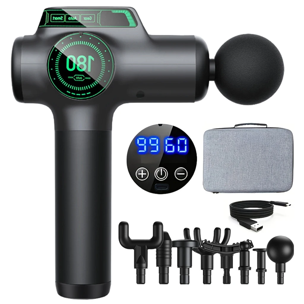 Brushless motor powers 5 speeds up to 3200 RPM for effective percussion therapy. Six interchangeable heads target calves, back, neck, and more. 2400mAh battery lasts 4 hours per charge.
